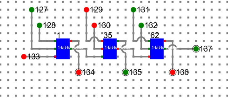 For parallel adder, just use 1_Bit_Full_Adder (1, 35, 62) as shown in the picture. We are experimenting with two binary numbers: 101 and 101. The result is 010 and carry 1.